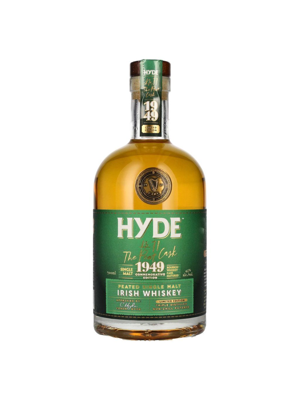 Hyde No.11 The Peat Cask 43% je rašelinová írska single malt whiskey vyrobená zo sladového jačmeňa sušeného nad dymom z rašeliny. Zreje v sudoch po bourbone z amerického bieleho dubu, ktoré sú po prvom plnení a vnútorne vypaľované, čím dodávajú jemnú sladkosť a tóny vanilky a karamelu. Na podnebí ponúka hladkú rovnováhu sladkosti a dymu s tónmi medu, hrušky a opečeného dubu, doplnenú výrazným sladovým charakterom.